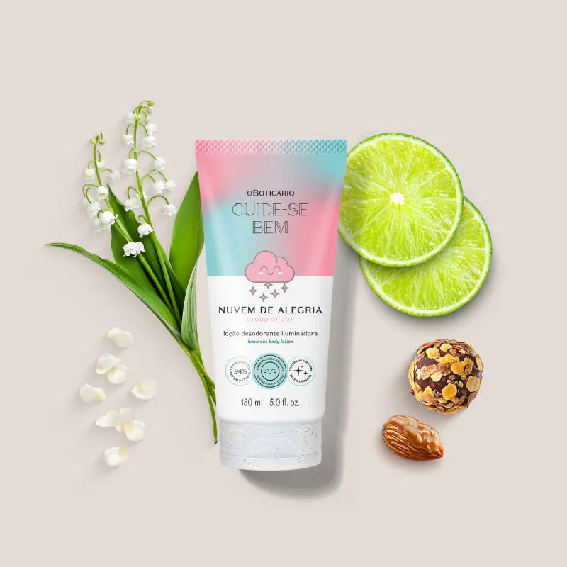 A Loção Desodorante Iluminadora Corporal Cuide-se Bem Nuvem de Alegria chegou para dar aquela levantada no seu astral! Hidratante com brilho para deixar sua pele iluminada, entrega uma fragrância frutal cítrica que promove sensação de felicidade, inspirando ao seu redor uma verdadeira nuvem de alegria!